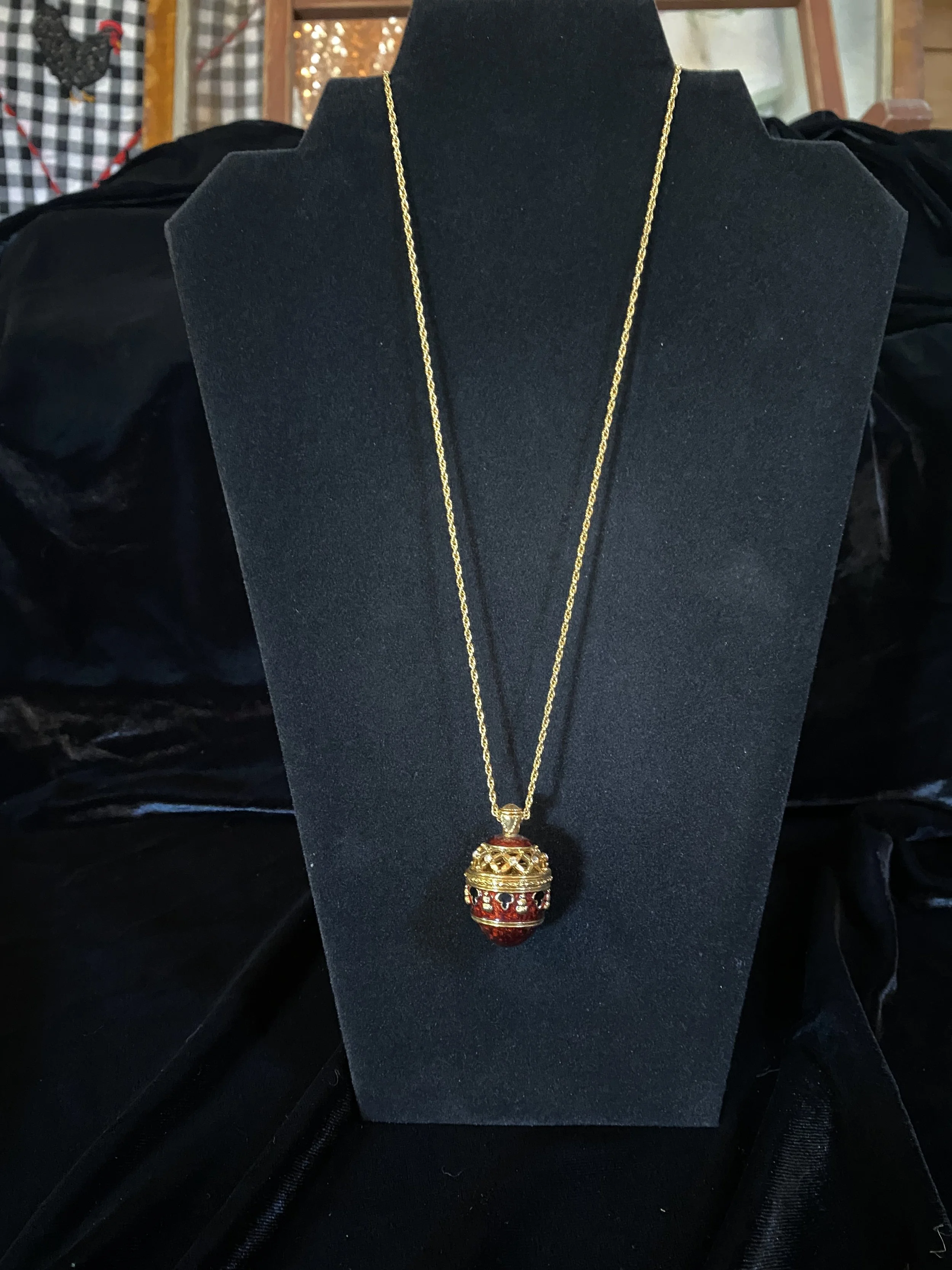 This necklace comes from Joan Rivers Classics Collection. The red and gold pendant has beautiful inlaid detailing reminiscent of a Fabergé Russian egg design and rests on a long gold chain.